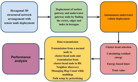 From inside to outside, the UWSN’s connectivity is separated into various little ring sections or Ar1 to Arn. RingW/OT, where RingW is the network radius and OT is the ideal connection path length threshold for sensing devices, can be used to identify the maximum number of ring regions. Dlmax is a representation of the route’s maximum delay. The frequency of Yij is equal to 5 whenever nodes i and j are connected. If not, Yij’s total value is 0. We view the search for multi-hop routes as a multi-objective optimization problem, with the sole objective of locating the best route at the most reasonable price. Following Equations (5)–(7) shows how an objective formula (Fobj) is obtained. The proposed system architecture is shown in Figure 3.