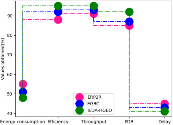 This section evaluates and compares the performance of the proposed improved efficient data aggregation in IEDA-HGEO with that of two existing widely used routing protocols: ERP2R and EGRC. These two algorithms were chosen because they are well-known in the literature and share the same objectives as the method under consideration. The following measures are utilized to assess the performance of the EE-DHS: Energy consumption, energy efficiency, throughput, network lifetime, and delay are all factors is represented in Table 2.