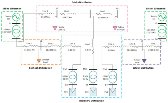 The Irbid District Electricity Company (IDECO) in Jordan gave sufficient data that was used to model the JSDN integrated with a PV farm as a real case study. Based on a load flow analysis, the model was constructed using the MATLAB–Simulink environment and validated using actual JSDN data. It was noted that the load bus voltage variation would eventually be resolved.