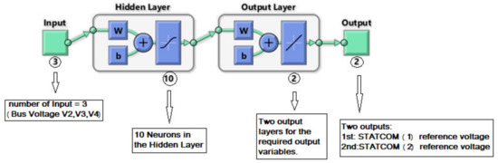 Although the PSO controller has a very high performance in solving the voltage regulation in the JSDN network, it is unable to respond right away to the dynamic changes in the network. Therefore, an ANN is proposed as an online mode to fulfill the voltage regulation quickly and accurately. Therefore, in this work, an ANN is trained and used to mitigate the real-time voltage deviation in JSDN, due to its high response compared to the PSO algorithm. The ANN can respond to different inputs and adapt its operation depending on the environment [38]. In this work, the ANN is trained by a Matlab-tool box and used for real-time solving of the voltage deviation in JSDN. It has two layers and ten neurons in the hidden layer, as shown in Figure 2. The dataset obtained by the PSO algorithm was used to train the ANN.