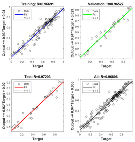 The training dataset consists of 150 cases for the deviation in three bus voltages and the reference signals of the STATCOMs. The input data to the ANN are the three bus voltages, divided into 70% for training, 15% for validation, and 15% for testing. Figure 3 shows the performance of the trained ANN in terms of the regression factor (R). The regression factor determines how close is between the dependent output variable and independent input variables. The training results of the ANN showed that a high regression factor was obtained, which is 0.96691 for training, 0.96527 for validation, and 0.97203 for testing.