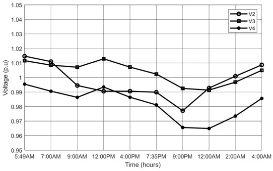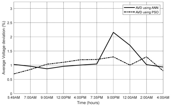 For the load and PV farm variations during the period of 5:49 a.m. to 4:00 a.m. shown in Figure 5 and Figure 6, the AVD of the three bus voltages (at bus-2, bus-3, and bus-4) is given in Figure 7. Results are obtained by applying the ANN control on the two STATCOMs located at both TPV2 and TPV3 buses. The very low AVD for all hours of the day proved the high capability of ANN control to achieve voltage regulation. Additionally, the results showed that the AVD-curve for ANN is very close to the one of PSO, proving that the ANN was well trained to give high performance for voltage regulation. Figure 8 shows the voltage profile of the three bus voltages after ANN action during the period of 5:49 a.m. to 4:00 a.m., for changes in load and PV farm. The results have exposed the capability of the proposed ANN controller to regulate the bus voltages accurately and efficiently.