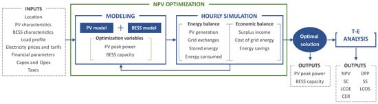 In order to carry out the economic profitability analysis, modeling simulation and optimization models were developed and implemented in the tool following the procedure detailed in Figure 1. The proposed approach evaluates a set of technical and economic indicators based on parameters such as the location of the installation, the user’s consumption profile, the characteristics of the PV and BESS elements, the electricity prices and the Capex and Opex, among others.