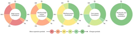 All tariffs currently available in Spain are included in the calculation tool along with their corresponding time periods and their respective prices. Considering that this research is mainly focused on the industrial sector, it is worth highlighting the 3.0 TD tariff, which is common in small- and medium-sized industries. It is a tariff, with six time periods for energy and six for power, applied according to the electrical seasons (high, medium–high, medium and low) and according to the time and the day of the week (weekends and holidays are discriminated), as detailed in Figure 2.