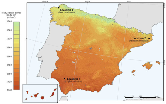 The developed analysis method is applied to different consumers and locations to evaluate the profitability of PV systems and storage systems in the current framework in Spain. In a general study, selecting a single location may lead to non-generalizable results, given the climatic diversity of the Spanish geography. In fact, on the basis of irradiation levels, Spain can be classified into five different climatic zones. In this study, prosumers are moved through the locations specified in Figure 3 to test the influence of irradiation on the profitability of PV installations and BESS.