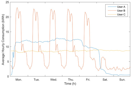 The dataset used contains hourly consumption data for the entire year of 2019. These data come from real users, specifically from small- and medium-sized industries, since this study focuses on the industrial sector. Considering that within this sector, consumption habits can be very different and can lead to very diverse results, three consumers with different load profiles were selected. The main characteristics of these consumers and their load curves are shown in Figure 4. Consumer C uses a relatively constant amount of electricity throughout the year and throughout the week. This consumer has similar consumption on weekdays, weekends, holidays and even at night. Consumer A, instead, is mainly active during weekdays, reducing their consumption drastically on weekends. The particularity of this consumer is that they also show remarkable activity during weekday evenings. Consumer B is not active at night or on weekends.