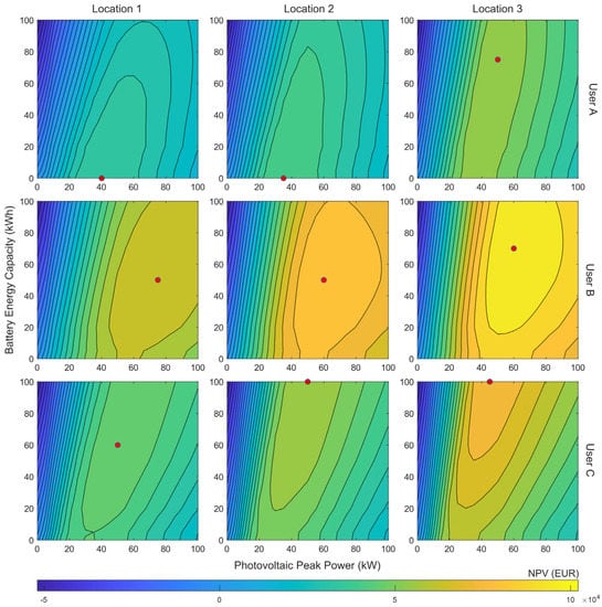NPV for different combinations of battery capacity and PV power for the users and locations analyzed using self-consumption model 2 and 0% BESS price reduction. The red dots indicate the optimal solution for each scenario.