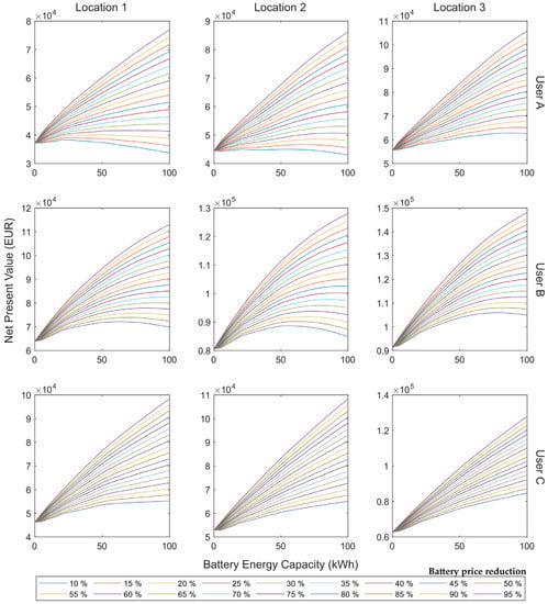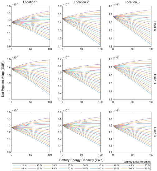 When comparing the locations, it is noticeable that larger reductions are necessary to observe a change in trend in the sensitivity analysis in the locations with higher irradiation. In addition, it is noteworthy that in these locations, higher NPV values are achieved with smaller installations in terms of PV power and storage capacity.