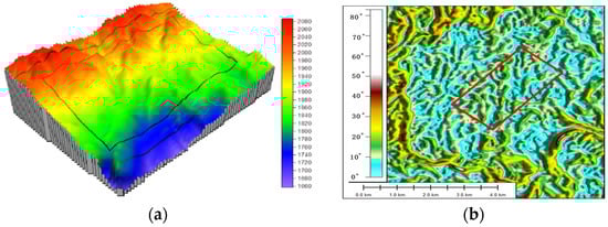 The work area is located in the Wumeng Mountain area in Western Guizhou Province of the Yunnan–Guizhou Plateau. The landform is mainly mountainous and hilly. The overall elevation trend of the work area is high in the west and low in the east, with an altitude between 1600 and 2100 m and a local height difference of more than 300 m (Figure 1a). The surface slope of the work area is relatively slow, mostly at 15–30° and partially above 40° (Figure 1b).