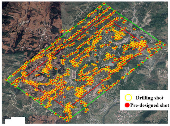 The construction mode of 3D seismic exploration was centralized acquisition after all wells were drilled, and the tasks of drilling and acquisition were assigned by dividing blocks according to the terrain. In the acquisition stage, the whole work area was paved with 5074 detection points, and then the acquisition was started. The SmartSolo 10 Hz node instrument was used to receive the data, and the borehole gun self-excitation system was used to shoot. In the field acquisition process, information such as the position and parameters of each shot file and each array sheet was recorded. After the acquisition was completed, the data were merged and cut with the support of SmartSolo technology. Then, technicians checked the shot information records, various shift reports, original shot sets, and superimposed profiles, and performed quality rating, which fundamentally guaranteed the quality of all original data. The drilling shot points in the work area are in accordance with the predesigned shot points, as shown in Figure 3.