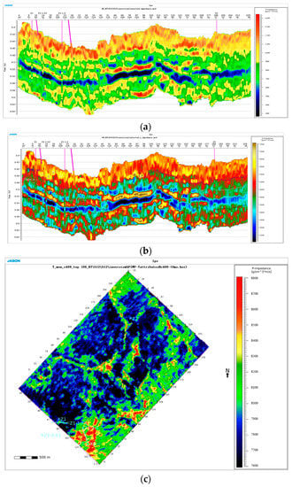 As shown in Figure 5a, the cross-section of the poststack seismic impedance inversion well connection in this work area shows that the coal seam can be well identified, but there is basically no ability to distinguish sand–mudstone, which is consistent with the petrophysical analysis conclusion. As shown in Figure 5b, from the P-wave impedance plan of the thickest C409 coal seam in this area, poststack seismic inversion can predict the change characteristics of coal seam thickness to a certain extent, which shows that this poststack seismic inversion test achieved the expected effect.