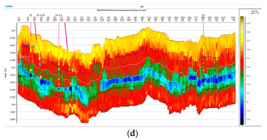 Through fine parameter adjustment, this prestack simultaneous inversion achieved good results. From the perspective of the inversion prediction profile, as shown in Figure 8a,b, the P-wave impedance and S-wave impedance wells are in good agreement, and the longitudinal resolution is better than that of poststack impedance inversion, which shows that some stacked data volumes optimized in this study have good AVO amplitude preservation and wavelet extraction is reasonable. The transverse distribution law of geological bodies from the P-wave impedance plan is consistent with the general law of poststack wave impedance inversion, but there are local differences, as shown in Figure 8c,d. The density of this prestack simultaneous inversion is also relatively stable. Generally, when the incident angle is small, it is difficult to obtain stable density by prestack simultaneous inversion, which also shows that the data preparation quality of this prestack simultaneous inversion is high.
