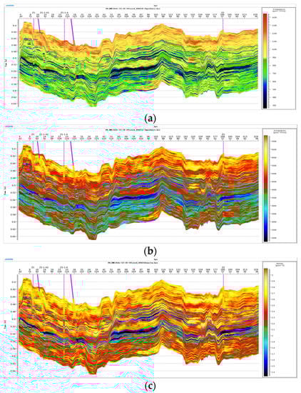 Thanks to the previous test basis of poststack wave impedance inversion, poststack geostatistical inversion, and prestack simultaneous inversion, we have a better understanding of the vertical and horizontal variation functions of the seismic, wavelet, horizon framework, and geostatistical parameters in this area. Therefore, this prestack geostatistical inversion parameter test is more targeted, and the inversion results are of good quality, as shown in Figure 10a–c. The prestack geostatistical inversion of P-wave impedance (AI), S-wave impedance (SI), and density (DEN) has good correlation with wells, reasonable vertical resolution, clear boundary of geological body, high precision, mainly density result, good stability, and vertical resolution.