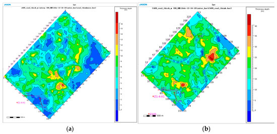Inversion map of coal seam thickness: (a) C605-C504; (b) C409-C406.