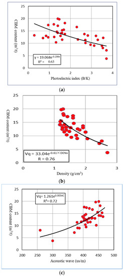 According to the report “Research on Guizhou CBM Logging Evaluation Technology”, compiled in 2016, predecessors used the experimental data of 43 coal cores from 6 wells in the Liupanshui area, established the calculation model of coal composition parameters through coal core calibration logging curves adopting the method of mathematical statistics, and analyzed the correlation between gas content and various logging parameters. The logging curve characteristics in the Liupanshui area have a good correlation with the test results of gas content in the coal core, and the gas content has a good correlation with photoelectric index, density, and sound wave. The correlation coefficients are 0.63, 0.76, and 0.72, respectively (as shown in Figure 12a–c).