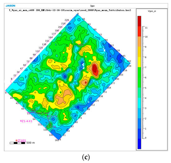 As shown in Figure 14a, the profile of the gas content in the three-dimensional well connection by using longitudinal wave impedance conversion shows that the gas content is in high agreement with the gas content interpreted by logging at well points, and the variation between wells can conform to the law of seismic data, with high longitudinal resolution and certain response to thin layers. It can be seen from the figure that the areas with high gas content are mainly concentrated in the middle of the lower coal seam. Based on this three-dimensional data volume, the gas content plans of the C605-C504 and C409-C406 layers (as shown in Figure 14b,c) are calculated, respectively. As shown in Figure 14b, the high-value area of gas content in the C605-C504 interval is distributed in the south–central part of the work area, showing a strip-like distribution with a nearly north–south trend. As shown in Figure 14c, the area with high gas content in the C409-C406 interval is distributed in the middle of the work area, with relatively low gas content near the fault and relatively high gas content in areas where the fault is undeveloped. The predicted results are in good agreement with geological laws. The local gas content in the C605-C504 interval can reach 5 t/m3, and the gas content In most areas is 1–5 t/m3. The local gas content of the C409-C406 interval exceeds 11, and the gas content of most areas is 4–11 t/m3, which is much higher than that of the C605-C504 interval coal seam.