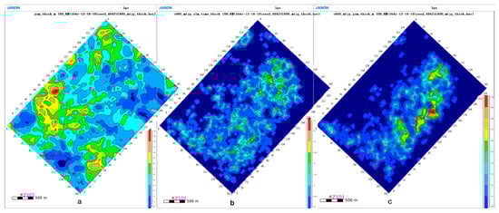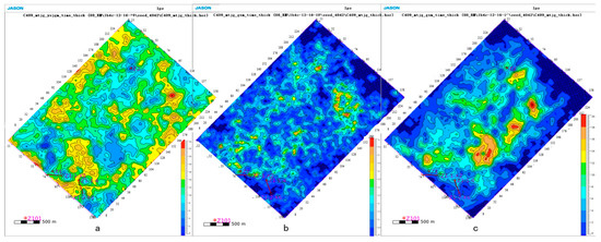 Plan of coal structure thickness distribution predicted by inversion of C605-C504: (a) primary structure coal; (b) fragmented coal; (c) structure coal.