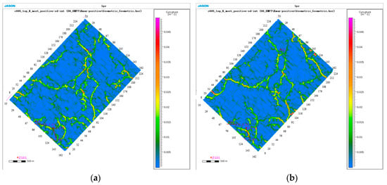 Firstly, the curvature of the C605-C504 and C409-C406 layers in this area is calculated. As shown in Figure 17, the maximum positive curvature of the C605 top surface and the C409 top surface curvature plan are in good agreement with the fracture.