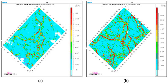After obtaining the curvature and Young’s modulus, the coal seam thickness of the main coal seam development section predicted by inversion is used to calculate the in situ stress. The result is as shown in Figure 19. The high-value area of in situ stress is consistent with the distribution height of faults, and the high-value area of in situ stress can be avoided by considering avoiding faults within 200 m in the subsequent well location deployment.
