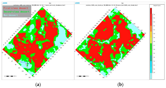 Sweet-spot map based on coal seam thickness: (a) C605-C504; (b) C409-C406.