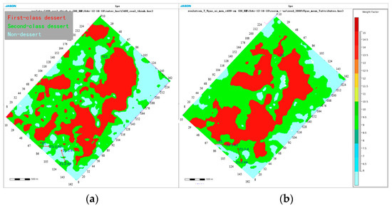 Based on this standard, the single-parameter sweet-spot plan is calculated for the three evaluation parameters of coal seam thickness, gas content, and coal body structure. As shown in Figure 21, the sweet-spot areas of coal seam thickness are mainly distributed in the middle of the work area, showing a strip-like distribution. As shown in Figure 22, the sweet spots of coal seam CBM content are mainly distributed in the south–central part of the work area, which is distributed in strips. As shown in Figure 23, the coal structure of the coal seam is mainly primary structure coal, while the other two types account for a relatively small proportion.