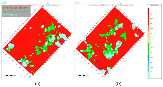 As shown in Figure 24, the comprehensive sweet-spot prediction plan of CBM in this area combines the characteristics of classified evaluation of three evaluation parameters, namely, coal seam thickness, CBM content, and coal body structure. It can be seen that the evaluation parameters of sweet spots in this plan range from 20 to 50, with 10 as an equal part. Those with scores between 40 and 50 are classified into first-class sweet spots, those with scores between 30 and 40 are classified into second-class sweet spots, and those with scores between 20 and 30 are classified into non-sweet spots. From the comprehensive sweet-spot plan, it can be seen that the characteristics of the three evaluation parameters of coal seam thickness, CBM content, and coal body structure are reflected, and each has its own emphasis due to the size of the weight value, which is a reasonable division scheme. The C409 coal seam has the largest distribution area in the desert area.