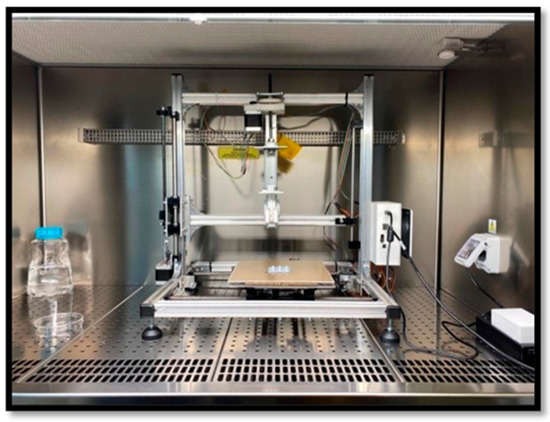 The chosen printer is a Cartesian 3D printer named 3DRAG, made by the Italian company Futura Elettronica, built of extruded aluminium profiles designed for interlocking or bolted fastening. The print bed can move along the X/Y axes, while the movement along the Z axis is exclusive to the extruder support bar. 3DRAG is also based on software compatible with the RepRap project; it can, therefore, benefit from a vast array of software and hardware that are natively compatible or easily adaptable. The limited dimensions of the machine (L: 50 cm, D: 42 cm, H: 62 cm, weight: 9 kg) easily allowed us to start and develop the printing process under sterile conditions within a controlled aspiration system (laminar flow hood) (Figure 1).
