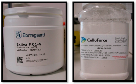For our studies, we used two types of cellulose: microfibrillar F cellulose (MFC) (EXILVA F 01-V, Borregaard, Sarpsborg, Norway) and Cellulose NanoCrystalline (CNC) (CelluForce NCC® NCV-100) (Figure 2).