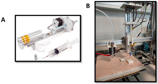 To proceed with the deposition of the bioink, the system used in the course of this work is based on the one that already equipped the 3DRAG printer, resulting in the modification of a rather peculiar accessory of the 3DRAG, which is suitable for the deposition of melted chocolate through the process of 3D printing. This accessory consists of a syringe holder and a piston moved by a threaded rod, a nut, and a cogwheel to couple the system with another NEMA 17 stepper motor. The extruder was modified in the end part; we decided to use common syringes with a capacity of 3 mL, Luer-lock, with 22G 0.625″ tip needles, as they are easy to find, cheap, and easily adaptable for this purpose. To hold the syringe in place, a syringe holder made of two main parts to allow for easy adjustments, was built (with PLA) with another 3D printer (Figure 3).