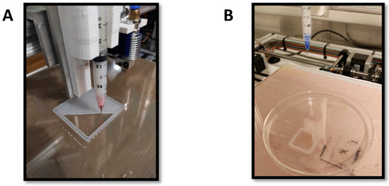 The first calibration of the printer was carried out to adapt it to the new configuration of the extruder: the lower limit switch of the Z axis was repositioned and then adjusted in order to have the nozzle of the syringe at the correct height with respect to the printing surface. After verifying the correct movements of the printer on all the axes, the first deposition test of the bioink was carried out. For the first series of prints, bioink1 was used, which is made up of alginate and microfibrillar cellulose, 2.5% and 1.5%, without cell components because the prints would not have been made in an aseptic environment (Figure 4).
