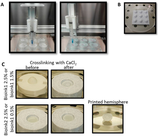 The deposition of the bioink in the biosafety cabinet. (A) on the left, the print of the hollow hemispheres (bioink1 2.5% or 1.5%) on white PLA molds with 9 mm diameter, (A) on the right, the print of bioink2 2.5% or bioink1 0.5% inside the crosslinked hollow hemisphere on grey PLA molds. (B) Grey PLA molds with 7 mm diameter. (C) Printed bioinks before and after crosslinking with CaCl2 and final 3D structure (hemisphere).