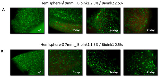 Structurally, bioinks were remained intact and easily manipulated throughout the duration of the culture (21 days). The cells showed optimal viability (95%) up to about one week of culture, in the following weeks the viability decreases to 85% up to day 21 of culture (Figure 6). This is likely caused by the prolongated culture period, the bioinks’ compact nature and the size of the 3D structure (hemispheres with a diameter of 9 and 7 mm). This last condition could influence the adequate transport of nutrients (and waste substances).