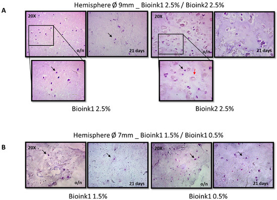 Representative histological staining (H&E) of the bioink1 2.5%/bioink2 2.5% (A) and bioink1 1.5%/bioink1 0.5% (B) samples. Black arrow indicates hUCMS. Red arrow indicates bioink2’s “oval structures” (20× and 40× magnifications).