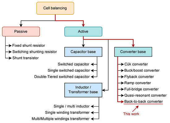 The main problem with a series of battery arrangements is that the total ’storable’ energy is dependent on the weakest battery. During discharge, the low-capacity battery empties first, forcing the entire storage (BESS) to shut down. During the charge, due to its incapacity of the absorbing charge, it quickly reaches its maximum voltage and must also stop charging the entire bank. Hence, an energy equalization system [6] is necessary at the cell and battery levels, which can be classified as passive or active balancing structures, as Figure 1 illustrates. The first type dissipates the excess energy in the form of heat, while the second type transfers the energy to the adjacent element.