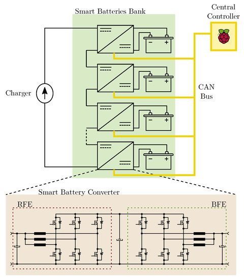 In this research, since the system enhances the battery behavior, the joint (battery plus electronic) is named a smart battery (SB) [9,10,11]. The combination of SB modules in series and parallel builds a smart battery bank that interacts with a charger, Figure 2. A central controller (CC) is responsible for managing the SB bank and commands the individual SBs via a CAN bus. It receives the converter measurements, such as the battery voltage and current as well as the DC link and terminal voltages, and calculates the terminal voltage setpoint of each module, taking care to keep the voltage sum constant. The CC is also responsible for turning the modules on and off, ordering them to enter the bypass mode, or resetting any error condition.