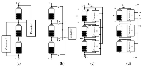 In the series cell-to-pack architecture, as seen in Figure 3d, energy transfer happens between the individual modules (cell plus converter) and the pack, but this process is more subtle since the modules are simply connected in series. The pack current flows through the string, but the converter controls the module terminal voltage. As a result, the energy supplied to or drawn from each module is proportional to the individual module terminal voltage. An example of the series cell-to-pack architecture involves the use of a cell-integrated bidirectional buck converter [7]. In a different approach [1,23,24], the modules operate in a bypass or inserted mode, in which the battery current is zero or equal to the pack current, respectively (the latter could also be classified as duty cycle balancing [13]).