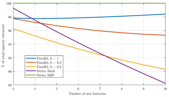 Another benefit is the opportunity to replace the batteries individually as they reach their end of life, as the other solutions are unable to cope with the large capacity differences that will appear as new batteries are introduced in banks with old ones. To evaluate this latter case of a bank with old batteries (that has a few replaced by new ones), the results of the linear programming are presented in Figure 5. A bank with 20 batteries is considered and the old batteries have a mean capacity of 0.7 Ah with a uniform distribution of ±0.10 Ah. To this bank, x new batteries replace the old ones, each with a mean capacity of 1.0 Ah with a uniform distribution of ±0.02 Ah. The graph shows the percentage of the total stored energy that the system can extract depending on the architecture adopted. Again, the proposed architecture using the back-to-back converter is the only one that can fully utilize the bank in all conditions. The parallel architecture also reaches high utilization, as long as the converter rating is high enough (in the simulated case, with a b > 0.35). The series architecture with a step-up converter has the worst performance when 12% of energy is not reachable when the bank is half old–half new.