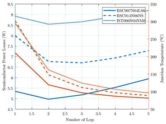 The semiconductor’s power losses were calculated for different Infineon MOSFETs assuming a switching frequency in the range of 50–100 kHz and a converter with up to five legs. The results, presented in Figure 6, show that a single-leg converter would result in junction temperatures higher than 150 °C and, consequently, failure. Among the devices considered, the BSC007N04LS6 consistently leads to the lowest losses. This device, a member of the Infineon OptiMOS 6 family, has 40 V of blocking voltage, drain-source resistance of 0.7 m, and a gate charge of 94 nC. The DC link is set at half of the rated blocking voltage, i.e., 20 V. If one considers natural cooling and only the PCB pads as heatsinks, the estimated thermal resistance junction ambient is 50 °C/W.