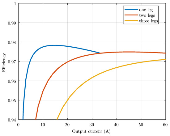 A multi-leg interleaved converter has several advantages over the conventional ones, such as an equivalent higher switching frequency, increased load handling capacity, and smaller passive components. Another benefit is higher efficiency under a partial load, achieved by reducing the number of switching legs depending on the load’s current level. Figure 7 shows the efficiency of the converter when one, two, and all three legs are switching, where the benefit of reducing the number of switching legs becomes evident (the efficiency with a lower number of switching legs is higher, independent of the load current).