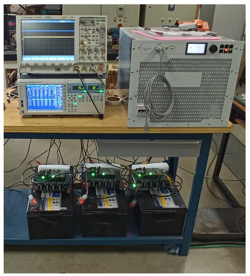 A prototype was built, which comprises two boards: a control board, SB_CTRL, and a power board, SB_POWER. The module prototype is connected to a lead acid 240 Ah battery (Figure 10) and the main system characteristics and converter parameters are summarized in Table 3 and Table 6.