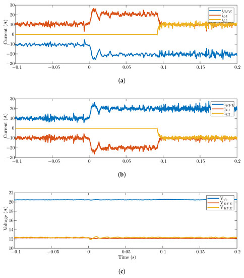 Converter response to a load step from 10 to 20 A. As the controller updates the RMS current value, it turns the second leg on and handles the current sharing, disturbing the terminal voltages. (a) BFE currents; (b) RFE currents; (c) BFE, DC, and RFE voltages.