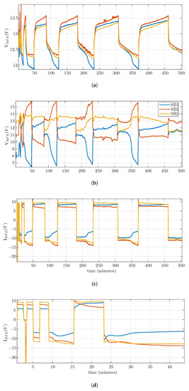 After the HiL validation, the firmware and control implementation were tested through an experimental setup consisting of a power bank with three series-connected SB modules and the central controller. Figure 12 presents the results of a long-term experiment using lead acid batteries with a capacity of 240 Ah (C20), model 12MS234, manufactured by Moura. The initial conditions of the experiment were set, such that the battery of SB2 was near full charge, SB1 was only half-charged, and the SB3 charge was between the other two.