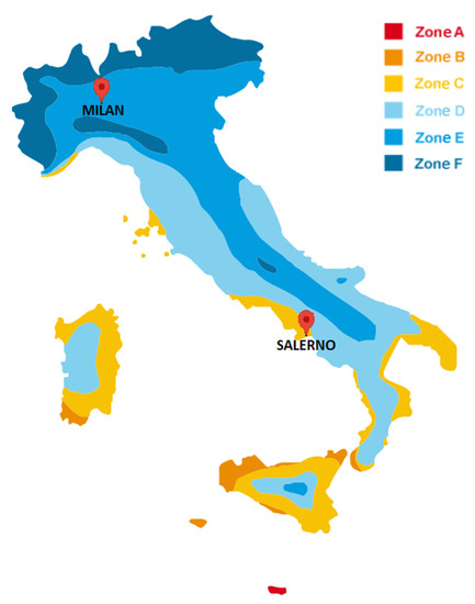 Two Italian cities, belonging to two different climate zones according to Italian national legislation, were considered [15]. In particular, the Italian territory is divided into six climate zones (A, B, C, D, E, F), based on average temperature and independent of geographical location, as shown in Figure 1.