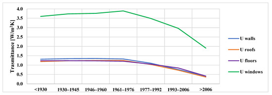 It can be seen that up to the 1970s, the average thermal transmittance by all components remained fairly constant, but then decreased, again due to passage of Law 373 of 1976 on energy efficiency and Law 10 of 1991. In the case of roofs, on the other hand, an anomalous increase was noted for the data available in [19].