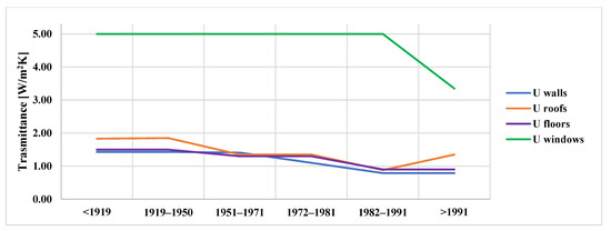 The energy analysis of private buildings carried out in the Municipal Energy Plan for the Municipality of Salerno [19], whose authors declared that the values of transmittance were taken from UNI/TS 11300-1:2008 [20], identified the trends in average thermal transmittance by opaque components and windows, as shown in Figure 3.
