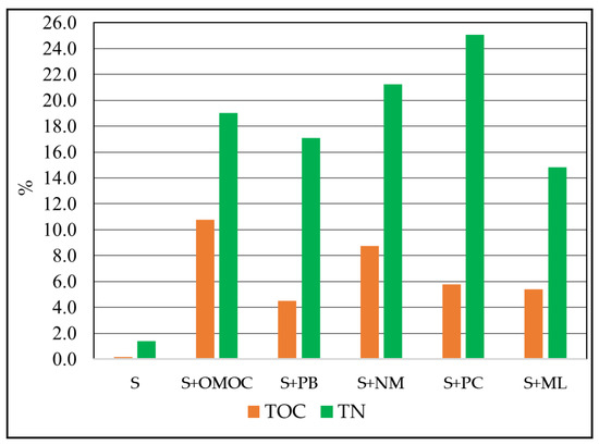 After mixing the biochars with the soil, the TOC/TN ratio values decreased and ranged from 10.04 (S + OMOC) to 53.17 (S + PB) (Table 2). After 60 days incubation of soil mixed with biochars, there was a noted decrease of TOC content in the range of 4.48% (variant S + PB) to 10.77% (variant S + OMOC) (Table 2, Figure 1). The losses of nitrogen were higher and ranged from 14.8% (variant S + ML) to 25.07% (variant S + PC). Higher intensity of nitrogen transformations as compared to carbon transformations resulted in broadening of the TOC/TN ratio. The increase of the TOC/TN ratio was highest in the variant S + PC and lowest for variant S + OMOC. The obtained results indicate that the introduction of biochar to the soil may contribute to carbon sequestration, mainly through the reduction of greenhouse gas emissions [19,39].