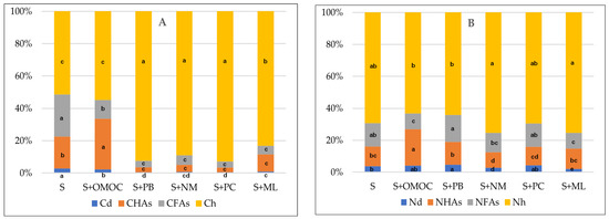 Nitrogen content in the fractions of humic and fulvic acids positively correlated with the total nitrogen content (r = 0.92 and r = 0.94, respectively). The addition of biochar did not cause significant changes in the share of Nh (Figure 2). The significant increase of nitrogen content was noted in the humic acid fraction, at 10.53 percentage points for the S + OMOC variant (Figure 2), which is a consequence of a significantly higher TN content in the BC compared to the other biochars (Table 1).