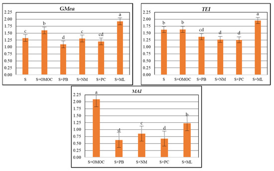 The trend of the influence of biochar from various feedstock was similar to that in the case of the GMea coefficient. Analyzing the MAI values, the soils with the addition of biochar from pine materials (S + PB = 0.627, S + NM = 0.852, S + PC = 0.676) exposed similar trends, but these were different from the soil with the addition, OMOC BC (S + OMOC = 2.092) and ML BC (S + ML = 1.226) (Figure 4). The MAI index significantly differentiated the influence of biochar with regard to the feedstock material from which it was produced.