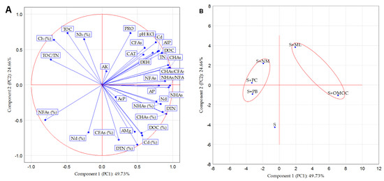 To explain the differentiation of the studied soil parameters, the principal components technique (PCA) was used. PCA enables investigation of the cause-and-effect relationships between the parameters. Multivariate PCA analysis identified three components that accounted for 90.79% of the total variance, most of which were explained by PC1 (49.73%) and PC2 (24.66%) (Figure 5A). PC 1 was mainly positively related to the content of TN (0.936), DOC (0.847), DTN (0.854), Cd (0.789), CHAs (%) (0.904), Nd (0.767), NFAs (0.888), NHAs (0.940), NHAs (%) (0.830), pH KCl (0.763) and AP (0.807) and to the activity of DEH (0.719), CAT (0.588) and AlP (0.806). Positive values mean that the greater the intensity of these features, the more important their contribution to PC1. Research by Liu et al. [66] indicated that a factor can be considered strong when its value exceeds 0.750. The second component (PC2) was significantly positively related with PRO activity (0.736) and TOC content (0.735) and negatively with DTN (%) (−0.846), Cd (%) (−0.716) and CFAs (%).