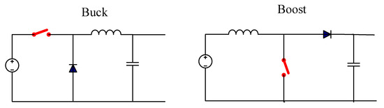 In recent years, EPC’s main research has focused on topology studies, which is categorized into single-stage power conversion and multi-stage power conversion [12,13]. The single-stage converters include buck, boost non-isolated topologies, and forward, flyback, push–pull, half-bridge, full-bridge, and other topologies. The multi-stage converter consists of two or more of these topologies. The topology described in [14] is a boost-based, non-isolated transformation topology. Compared with non-isolated topology, the advantages of an isolated topology are as follows: isolation protects the system from high voltages and currents caused by line surges or ground loops. The ground potentials in parts of a satellite are not equal, so ground currents are generated between systems. Without isolation, this current can introduce noise into the system, reduce measurement accuracy, and even destroy system components. The authors of [15] describe the difference between buck and boost topologies in many aspects. For example, to achieve the same ripple of inductor current, the boost topology needs more inductance than the buck, but the rms current through the inductor is much less than that of the buck, with the buck topology requiring a large and expensive capacitor to smooth the discontinuous input current. The buck and boost topologies are shown in Figure 1, and if a short-circuit fault occurs in the power switch (the red one) of the buck circuit, it does not affect the power supply; however, if the same fault happens in the boost circuit, the power supply will be short-circuited. In addition, the comparison of isolated topology characteristics is shown in Table 1.